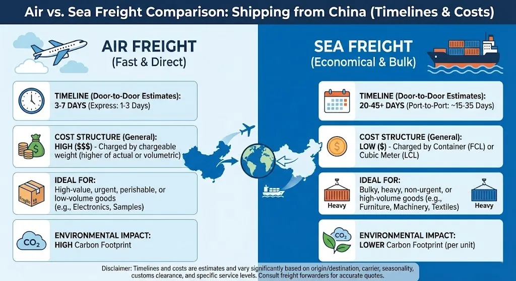 (Thuas: infographic comparáide lasta Aeir vs Farraige le haghaidh loingseoireachta ón tSín, ag cur béime ar amlínte agus costais)